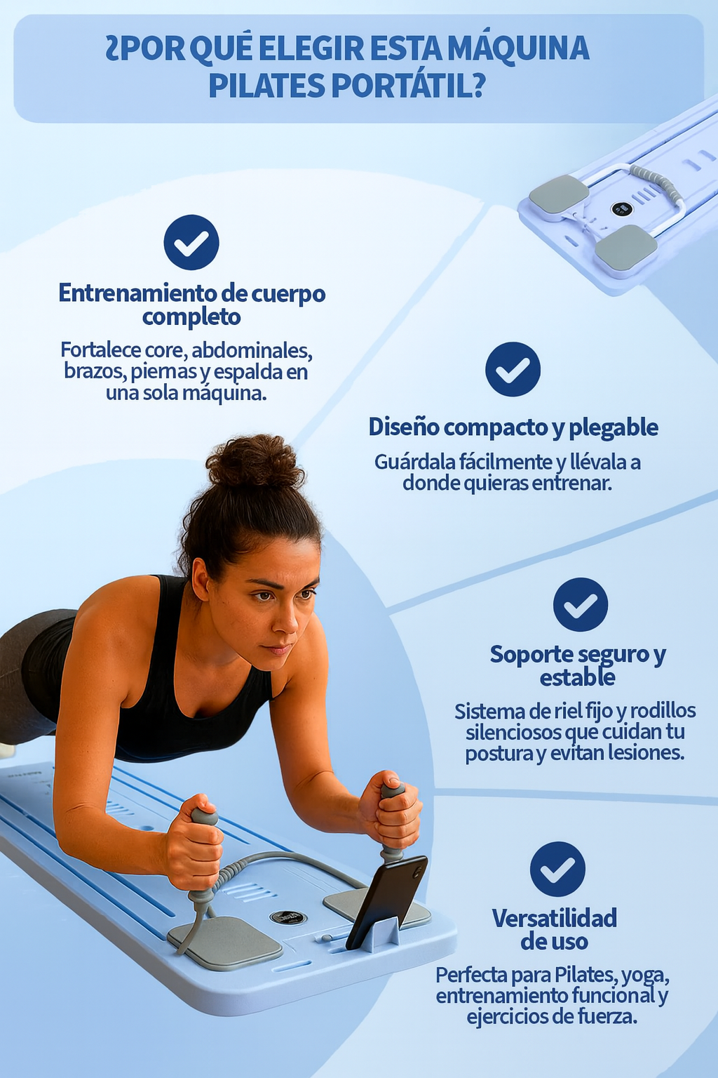 Fortalece, tonifica y estira tu cuerpo sin gastar horas ni espacio, gracias a su diseño multifuncional y fácil de usar. Ideal para cualquier nivel, incluye todo lo que necesitas para entrenar con seguridad y ver resultados rápidos.